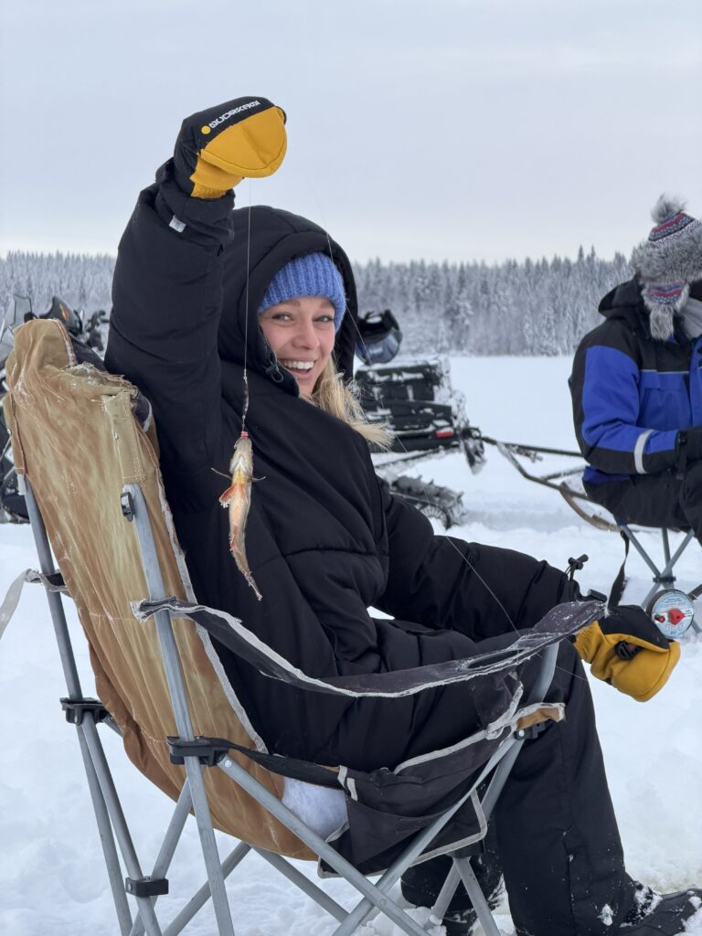 Ice fishing is a quiet Finnish tradition — slow, simple, and deeply connected to nature. On a frozen lake surrounded by open wilderness, you’ll sit comfortably on the ice, wrapped in warm layers, with a hot drink in hand.